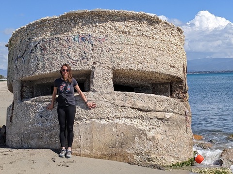 Lindsay in front of a WW2-era bunker on the Cagliari, Sardinia, shore of the Tyrrhenian Sea
